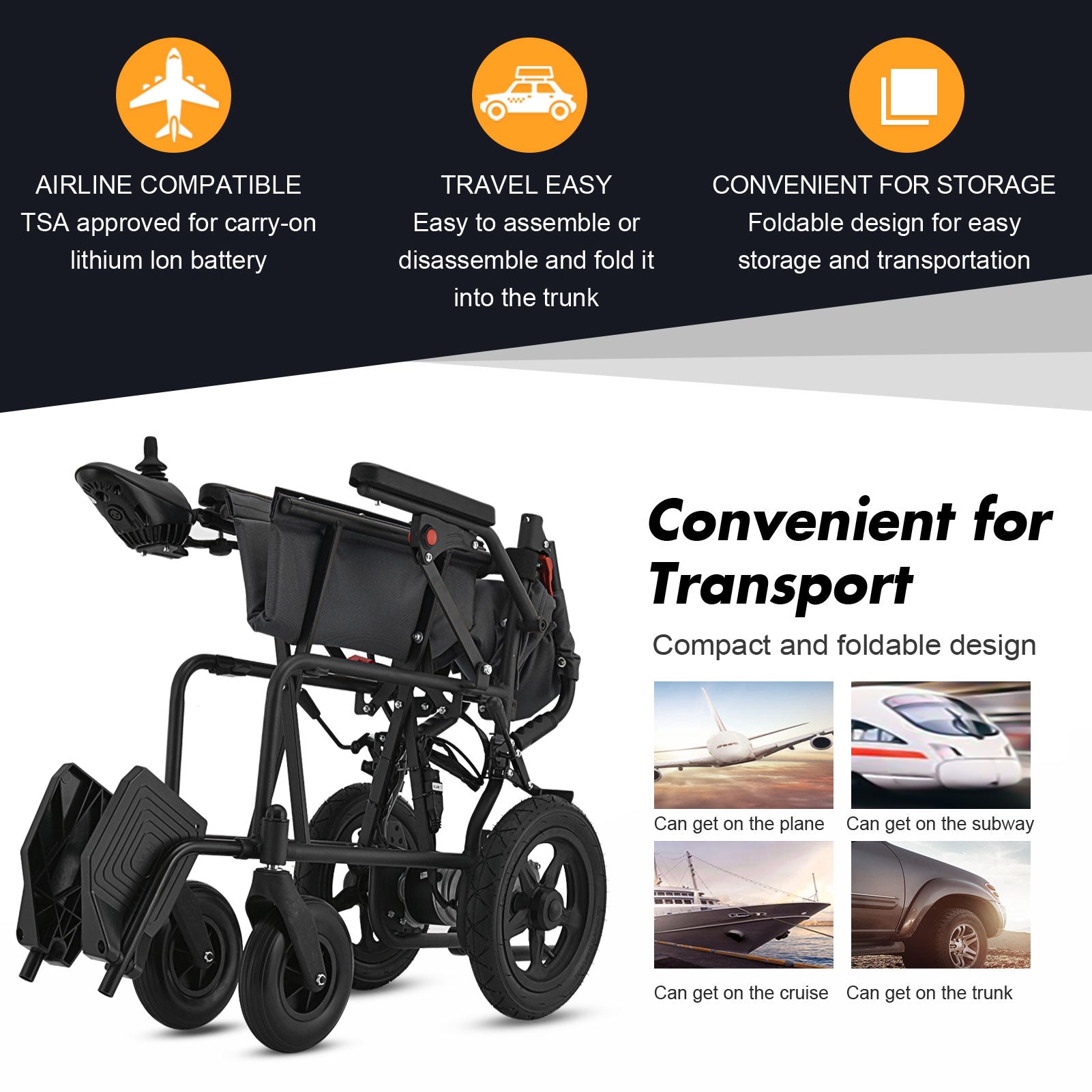 Experience freedom and independence with our premium ultralight electric wheelchair , crafted from high-quality aircraft-grade aluminum alloy for maximum durability and portability. Weighing just 46.3 lbs (including battery: 52.2 lbs), it’s easy to maneuver and transport. The quick-fold design lets you collapse it in 3 seconds , with a compact folded size of 25.6” x 15” x 26.4” , perfect for car trunks or travel. Get high-end safety, power, and comfort without the premium cost. Prfect for travel, storage and daily use (ideal for cars, buses, and tight spaces). Combines stability (anti-tip wheels), responsive control (joystick + horn), and all-terrain durability.