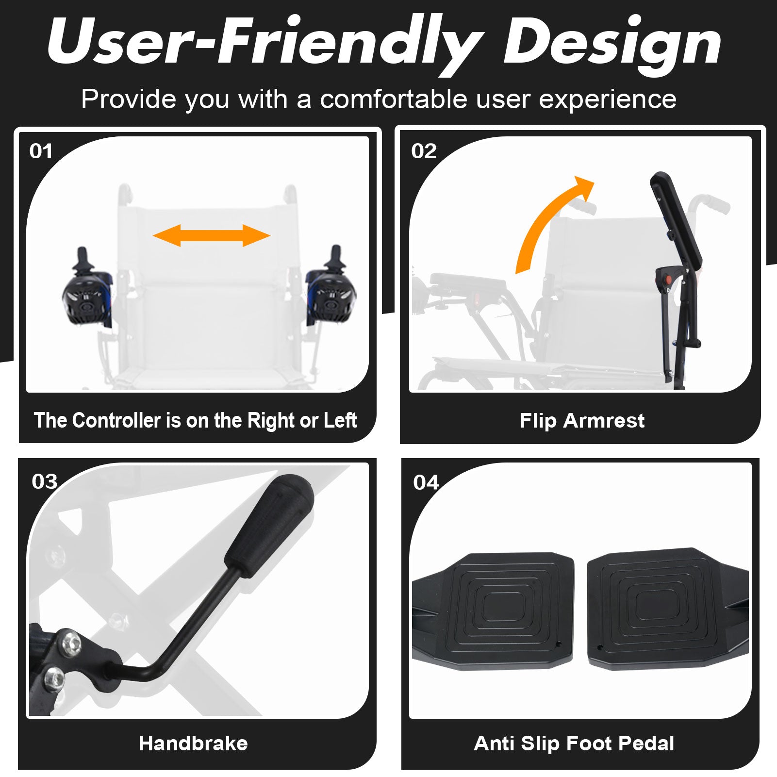 Dual Safety Handbrakes + Anti-Tip Wheels – Extra control in emergencies and added stability on uneven ground.