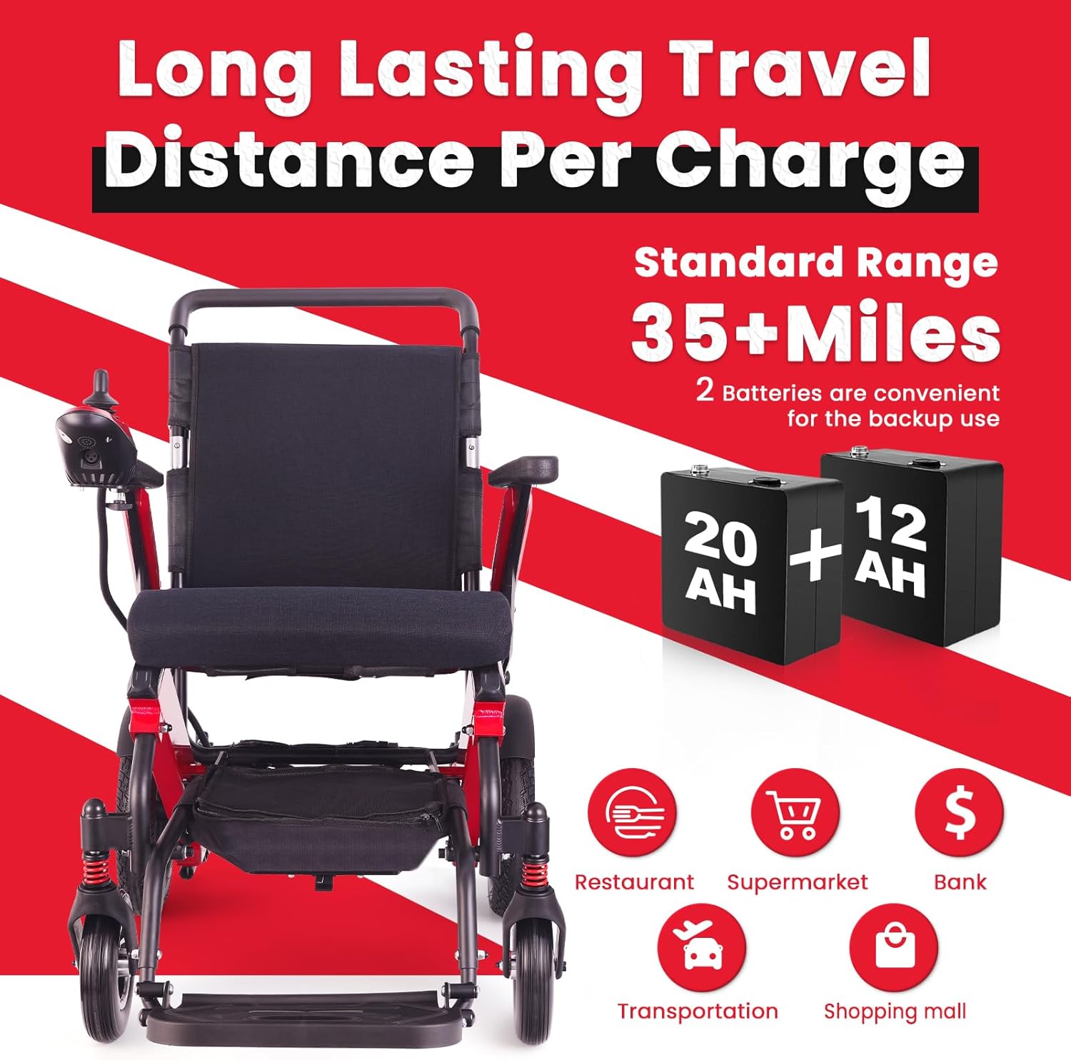 35+ Miles Extra Long Travel Range, Electric Wheelchair for Adults Lightweight Foldable, All Terrain Motorized Power Wheelchair Portable, Airline Approved (2 Batteries)