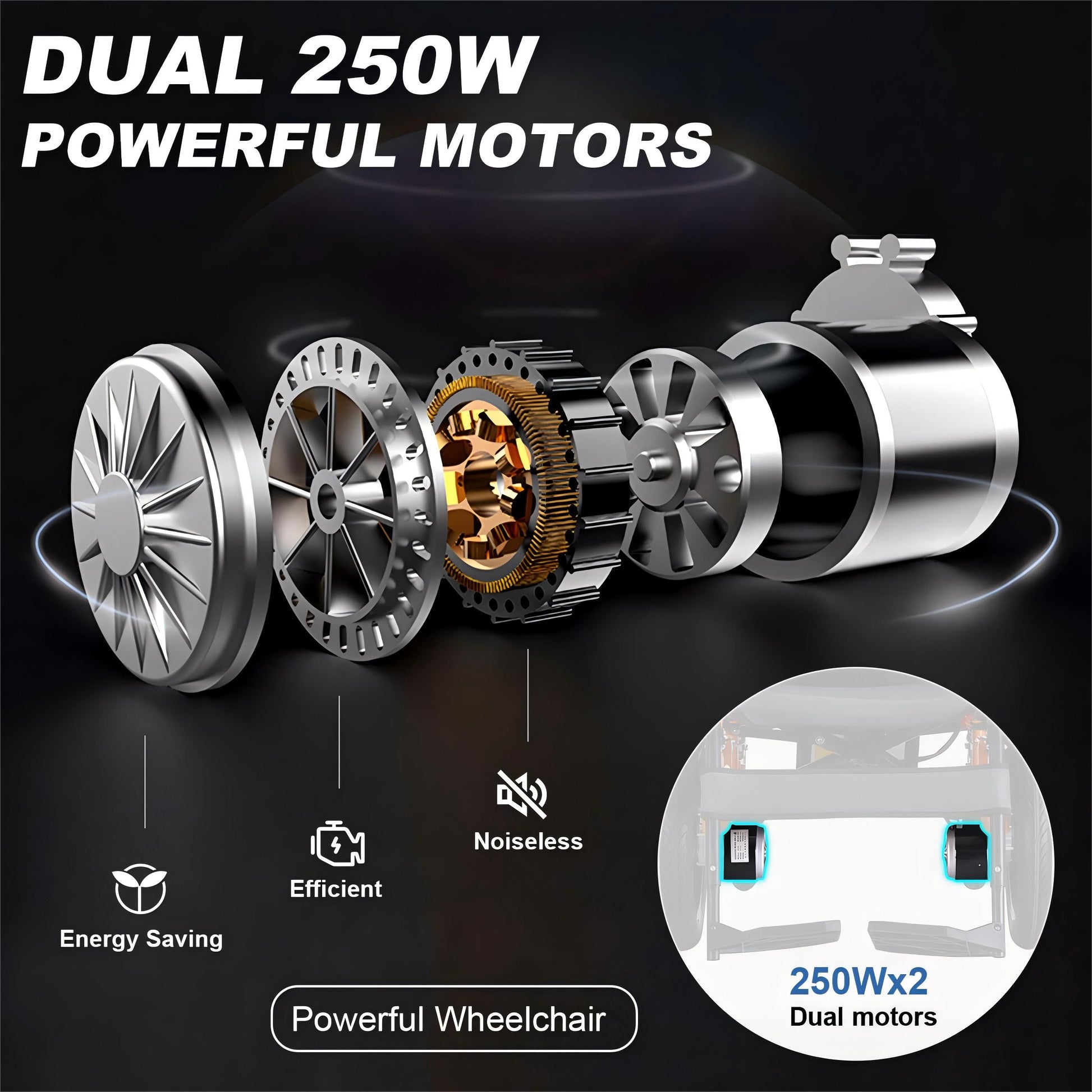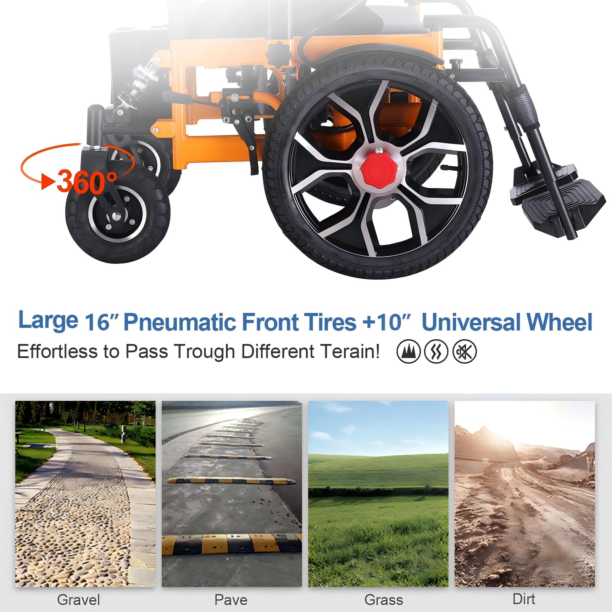 【All-Terrain Performance】-Built for grass, sand, snow, or rough roads, this wheelchair boasts 16" front tires and a robust dual-motor system (2x250W) to conquer 8° slopes and obstacles.