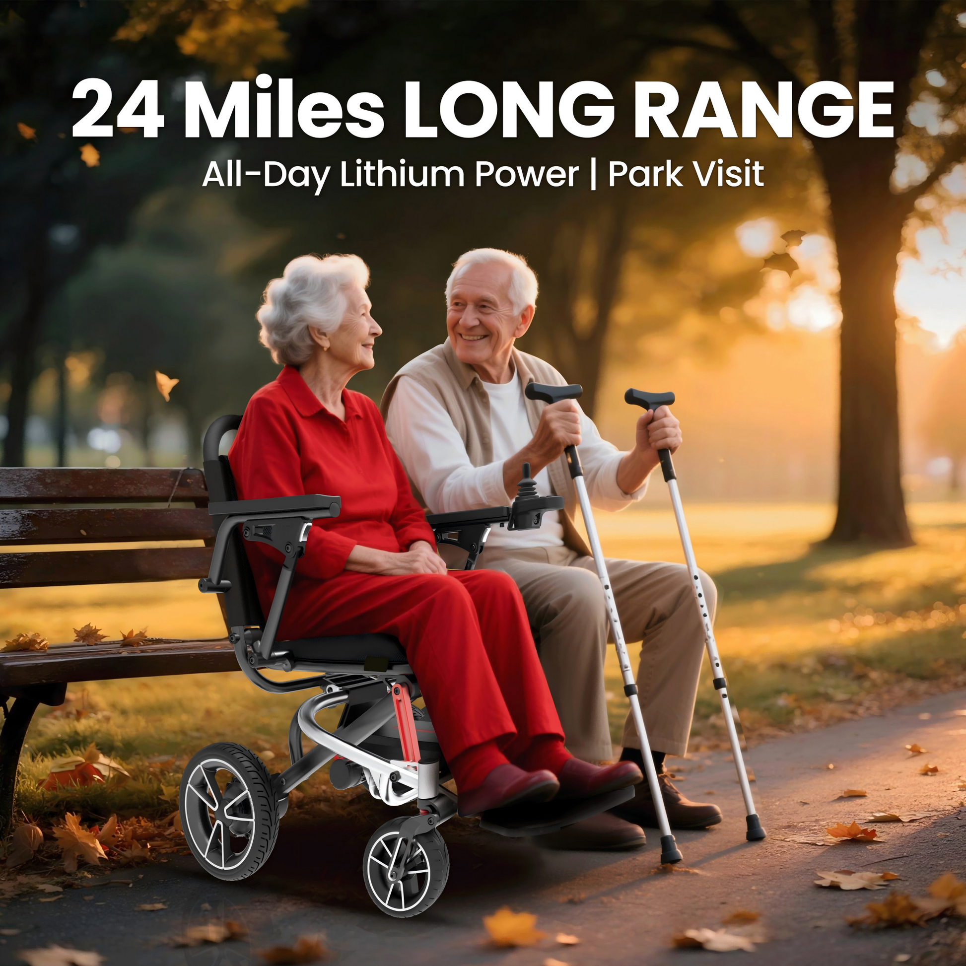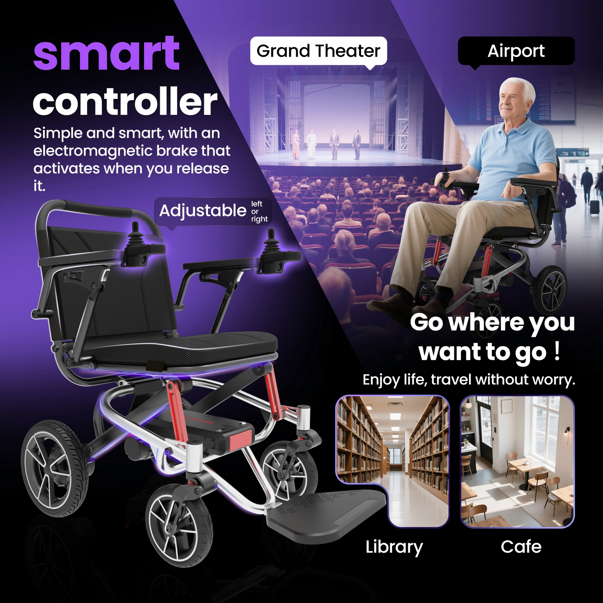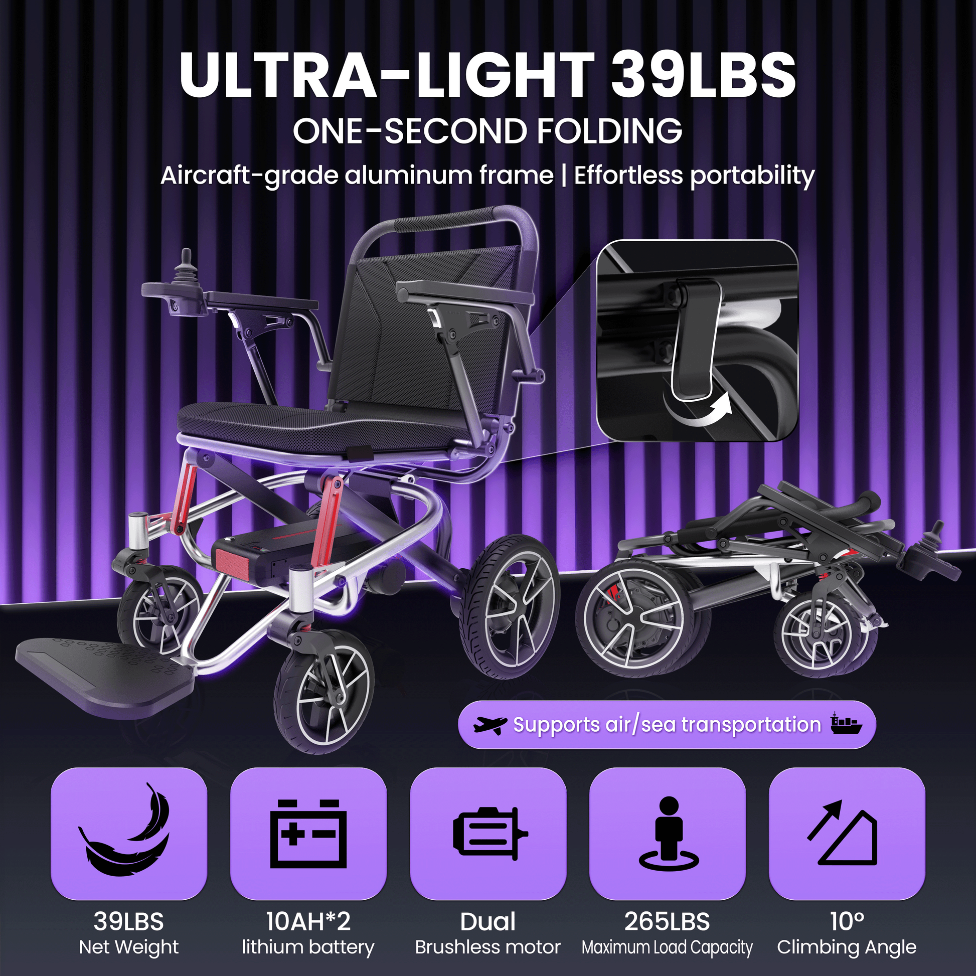 Ultra-Compact Lightweight Electric Wheelchair-Weighing just 39 lbs. It folds in seconds to fit in most car trunks.