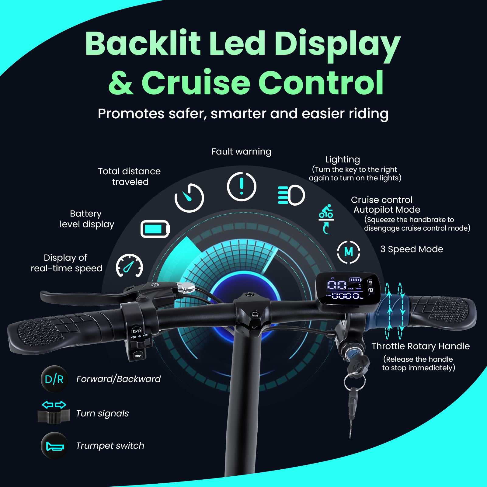 Smart Safety System: Includes an intuitive Backlit LED Display (speed/battery/mileage), Cruise Control, and a full lighting system (headlights/turn signals). The solid double front wheels and hand brake ensure stable handling on various terrains.