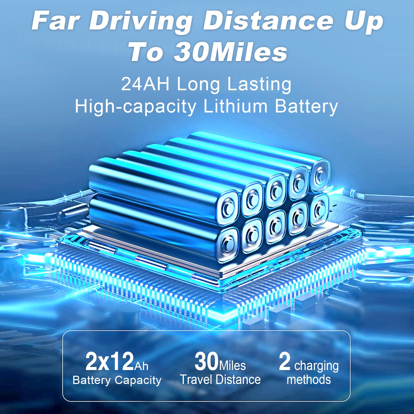 Long-Range Freedom: Features a 24AH High-Capacity Lithium Battery (2x12AH) delivering an impressive range of 30+ miles (48+ km) on a single charge.