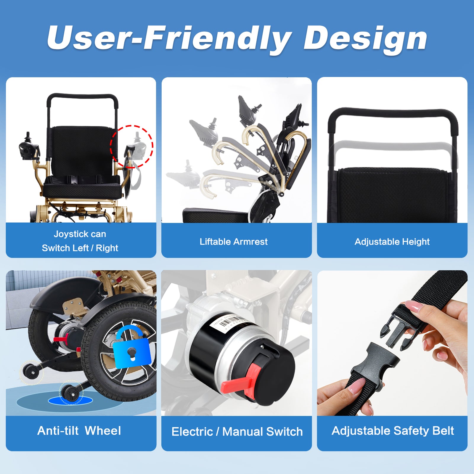 Smart & Safe Control: Features a 360° intelligent joystick with speed and battery display. The controller is switchable (Left/Right) and includes anti-tilt wheels and an electromagnetic brake system for maximum safety.